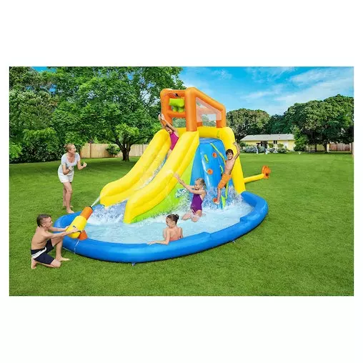 Setup is quick and easy. The heavy duty blower inflates the water park in less than 2 minutes.