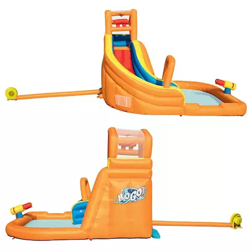 Slide, splash and a whole lot more. Our inflatable Bestway Water Slide is one great water play centre. It comprises a curved slide, splash pool, tipping bucket, water gun, climbing wall and a mesh-protected bouncing playpen. With so much to play with, your kids will definitely enjoy every single moment with it. Made of the durable and colourful PVC-coated polyester that is resistant to punctures and tears, the slide is also UV-resistant for more fun in the sun. It inflates in under 2 minutes with the supplied blower. The tipping bucket and water gun keeps the slide and rider wet for more thrilling rides. Ground stakes are also provided to ensure the slide stays firmly in place with all the robust play. It is made to last, but should an accidental tear occur, our supplied repair kit should be adequate to patch the fun back with minimum fuss. So get ready for summer with our water slide and let your children have a splashing great ride.