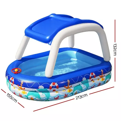 The Bestway® Sea Captain Family Pool is the perfect way for families to play in the water together! While they play, the UV Careful™ canopy will keep them cool and have more safe fun in the sun. Plus, the canopy is removable, giving you the convenient option to remove it and use the pool without it. The sturdy pre-tested vinyl construction also makes the Sea Captain durable while the 3-ply side design ensures that it stands up to robust play with the young ones. Better still, the Sea Captain pool has a built-in steering wheel with a horn that allows kids to pretend they are the captain of the ship as the navigate the wild waters of the sea and honk at the other boats passing by. Set sail on summer fun and let their imaginations run wild as they play under the shade of this family pool. Not least, an emergency repair kit is also included for fast patch-ups.