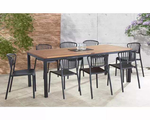 The Florence-Lynx 9 Piece Dining Setting in black is the perfect addition to any outdoor entertaining area. This stylish and durable set includes the Florence grey dining chair, made from injected molded polypropylene with added benefits of weather resistance and UV stabilization.