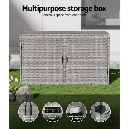 Looking for some extra storage space for your garden or outdoor essentials and tools? Gardeon has you covered with this stylish and versatile Wicker Outdoor Storage Cabinet. The outdoor cabinet is made from durable handwoven wicker that is UV and weather resistant and boasts a strong steel frame with excellent weight capacity – 60kg per shelf and 90kg on the top cover. It has two layers of inner storage space with two different ways of opening. It flaunts a fantastic 2-in-1 design: you can use it as just a storage cabinet, or as a cabinet and side table. It is inherently safe with its wide variety of features including a safe hydraulic hinge, convenient rope handles, durable anti-rust hinges, non-slip foot pads and wall attachments to prevent tipping. Suitable for indoor and outdoor use, you can add style and function to anywhere in the home with a Gardeon Wicker Outdoor Storage Cabinet.