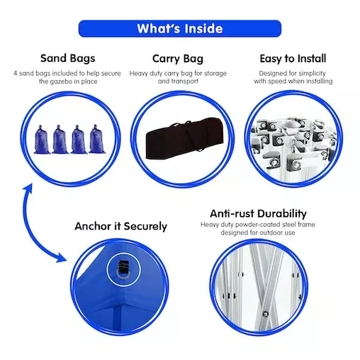 As well as the main unit and 5 walls this combo pack also comes with a handy carry bag and sandbags to help secure your marquee. And to make things a little easier our quality marquees are fitted with nylon inserts in the frame which eliminates frame jamming often experienced when erecting cheaper units.