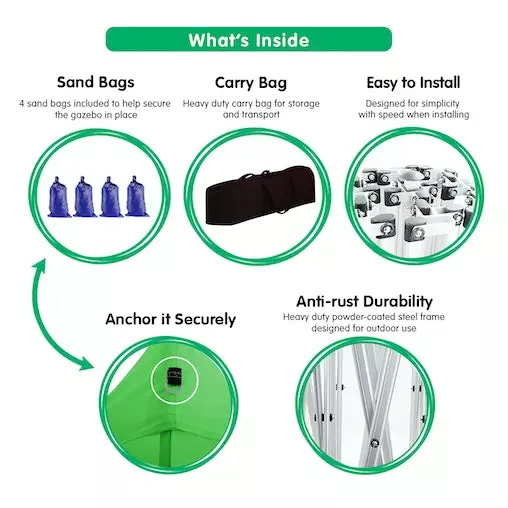 As well as the main unit and 5 walls this combo pack also comes with a handy carry bag and sandbags to help secure your marquee. And to make things a little easier our quality marquees are fitted with nylon inserts in the frame which eliminates frame jamming often experienced when erecting cheaper units.