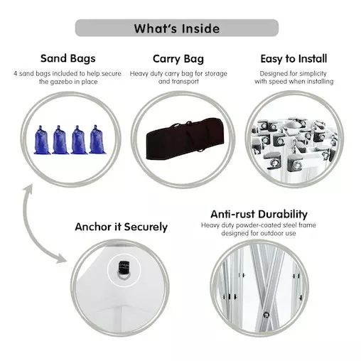 As well as the main unit and 5 walls this combo pack also comes with a handy carry bag and sandbags to help secure your marquee. And to make things a little easier our quality marquees are fitted with nylon inserts in the frame which eliminates frame jamming often experienced when erecting cheaper units.