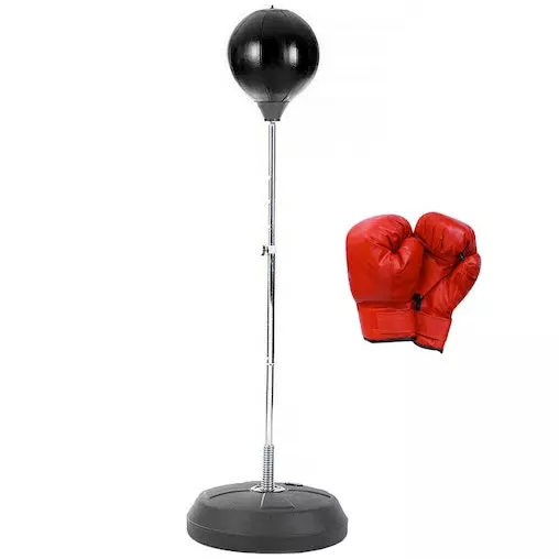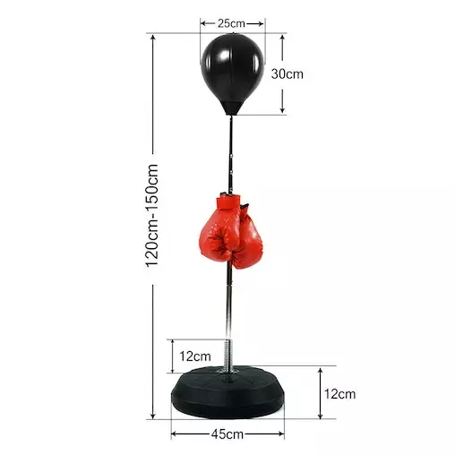 This Free-Standing Boxing Set comes pre-packaged with a punching ball on a sturdy stand, pair of boxing gloves, air pump and spanner. With easy assembly, this boxing set features a durable PU punching ball, sprung chrome bar, 12cm tension spring and a steel stand mounted on a sturdy base. Simply fill the base with sand or water for added stability and adjust the height between 121cm-145cm to get started.