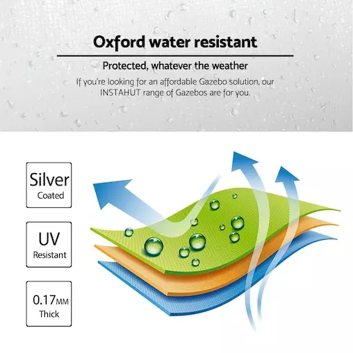 Featuring high density, long lasting silver-coated oxford fabric with effective UV and water repellent treatments, this INSTAHUT 3X3 Pop Up Gazebo provides a lovely ground and canopy coverage of 300 x 300cm. It is perfect for all your upcoming outdoor activities, as a sunshade station as well as a shelter for unexpected rains.