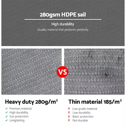 Designed to be a permanent covering, our Shade Sail is made from highly breathable 280g/m2 commercial grade 100% polyethylene fabric. This allows cooling air to pass through and help keep the under shade areas well ventilated. The material also blocks up to 98% of harmful UV rays and is all-weather proof to suit Australian climatic conditions. Plus, the material is further enhanced with Americhem UV-resistant additive from the USA to prolong its UV protection effectiveness.