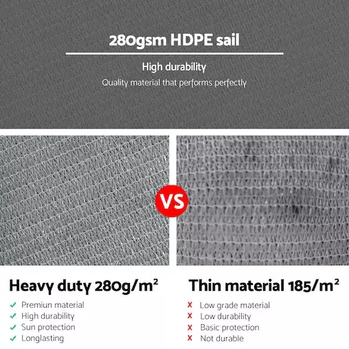Designed to be a permanent covering, our Shade Sail is made from highly breathable 280g/m2 commercial grade 100% polyethylene fabric. This allows cooling air to pass through and help keep the under shade areas well ventilated. The material also blocks up to 98% of harmful UV rays and is all-weather proof to suit Australian climatic conditions. Plus, the material is further enhanced with Americhem UV-resistant additive from the USA to prolong its UV protection effectiveness.