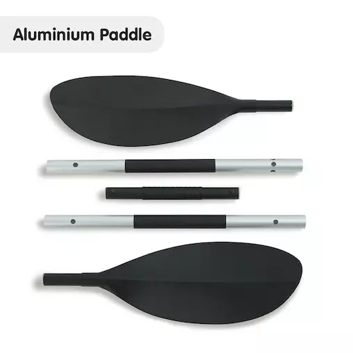 This kayak features grab lines on both ends and a cargo net at the front for extra storage. It also comes with an aluminium paddle, a storage bag, and an Intex high-output hand pump for quick inflation and deflation.