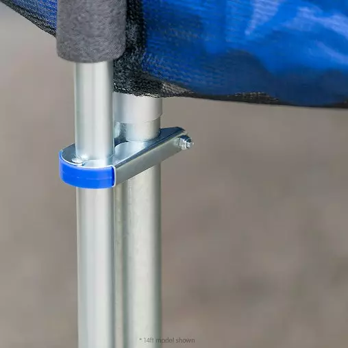 This is a heavy trampoline and uses linked legs and grounding straps for superior stability. The structure of the legs also minimises the tendency for legs to dig into the ground.