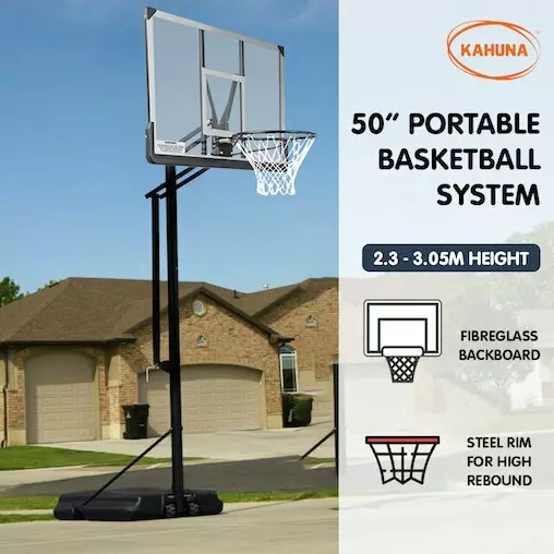 Play like a pro with the Kahuna Portable Basketball System. Featuring a 50-inch fibreglass backboard, this hoop looks and plays just like a professional basketball ring.