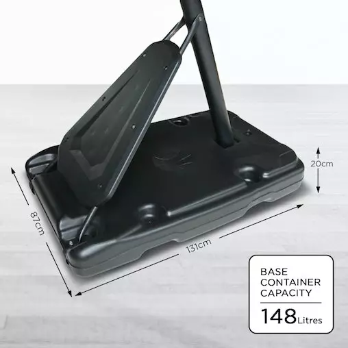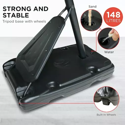 Don’t hold back on those epic shots – this basketball system has a breakaway rim to withstand repeated dunks. The metal frame is built to last, and you can strengthen the foundation by filling the base with water or sand.