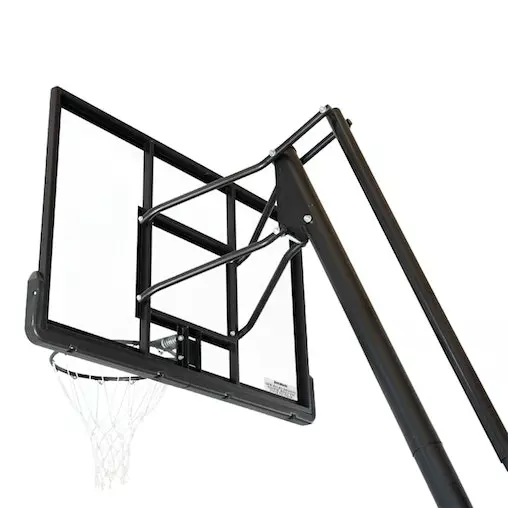 The 56-inch backboard is larger than most and provides excellent rebound like pro-style glass. The polycarbonate material is thick and shatterproof, making it ideal for outdoor use. And the steel rim is highly responsive for the best playing experience.