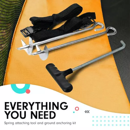 This is a heavy trampoline and uses linked legs and grounding straps for superior stability. The structure of the legs also minimises the tendency for legs to dig into the ground.