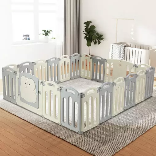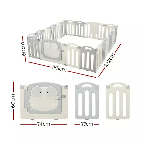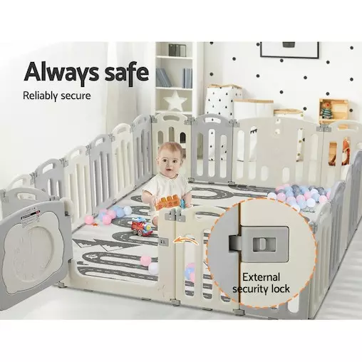 As a parent, sometimes you need a moment to catch your breath while keeping a watchful eye on the little ones. Keep your children safe and sound while you work with a Keezi Baby Playpen. The pen is made from quality HDPE material that is child-safe, non-toxic and easy to clean. It features a flexible 20-panel arrangement with no sharp edges and a safe 60cm height to prevent your child from crawling out. Each panel is connected to a hinge, and the main door panel has a safety lock to prevent a cheeky escape. Anti-slip suction cups keep the playpen firmly in one place. Easily assemble, fold and unfold the playpen for portability and simple storage(The door needs to be removed to fully fold). When you need a safe space for your child, Keezi has you covered with the Keezi Baby Playpen.