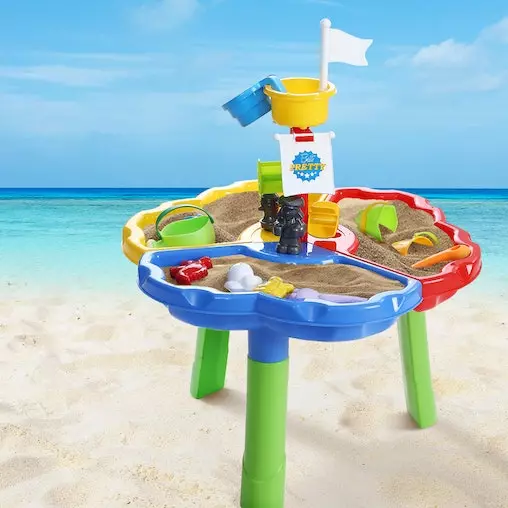 Your children will simply love our Keezi Sand and Water Table! With lots of individual pieces and many moving parts, the sand and water table takes your kids into a world sand and sea. Suitable for children three years and older, the sand and water table is designed and made in accordance with EN71 Safety of Toys certification standards. That means it is completely safe for your children with total peace of mind. Not least, the toy is also made of non-toxic and eco-friendly materials. Set it up in the backyard or bring it to the beach, the sand and water table’s three-legged design ensures the assembly stays firm and steady on both sand and water despite its light weight. Your children will have a whale of a time playing with the waterwheel, rainy cloud and more. Better still, use the table and sand mould to create sandcastles for more whimsical imaginations. Neatly packaged in a colourful box, the sand and water table is the perfect gift for the season or any birthday event.