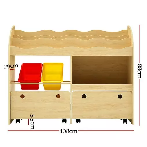 Encourage your little ones to read and learn to organize things with our Kids Display Shelf. With display shelves, storage boxes and removable drawers, the ensemble is made of durable MDF board. The boxes are made of PP plastic and are removable. Plus, the spacious drawers are also removable and provide even more storage options. The overall design is made child-safe with smooth round corners and easy-to-reach accessibility. Not least, the lockable wheels enable the unit to be firmly in place with every use.