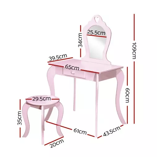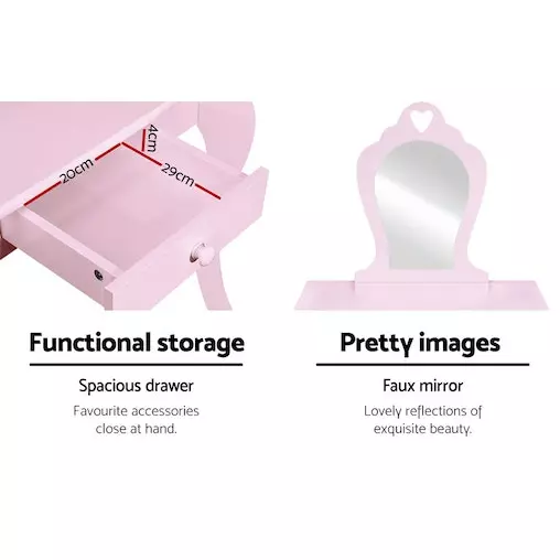 Certainly a dream come true for every little princess. Her very own makeup zone. And the Keezi Kids Dressing Table Set is just perfect for your girl to have a beautiful time doing her own makeup and getting ready for a fashionable start with her friends. The gorgeous set includes an elegant dressing table with a faux makeup mirror to reflect her awesome beauty. The large functional drawer also provides plenty of storage space for all her favourite accessories and more. Constructed with safe rounded corners and edges, the table and chair set is absolutely safe for use by your child and designed to handle robust use with its strong weight capacities.