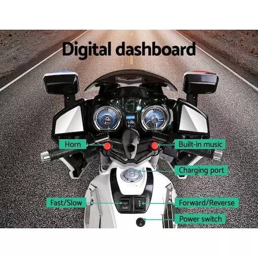 Powered by a 50W 12V rechargeable battery, the Bike can reach a top speed of 7km/h. But not to worry. The triple wheel construction will give the Bike lots of stability as would the anti-slip tyres for added traction. Handling the Bike is a breeze with all the handy controls such as forward and reverse motion switch, horn, light switch, step-on pedal and even MP3 connectivity to blast away more songs on top of the six built-in tunes. Press start and the Bike gives up a roaring growl just like the real thing.