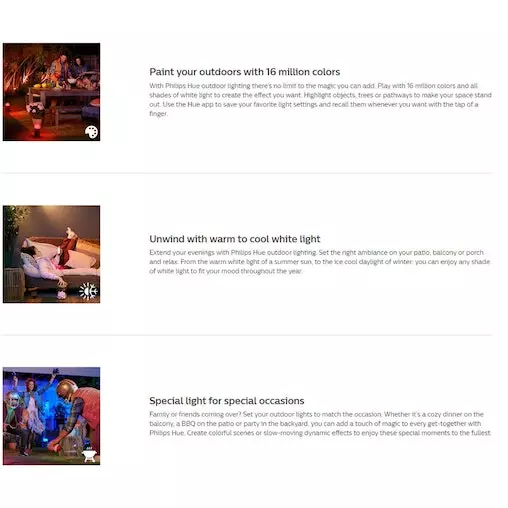 Highlight objects, trees or pathways to make your space stand out. Use the Hue app to save your favorite light settings and recall them whenever you want with the tap of a finger.