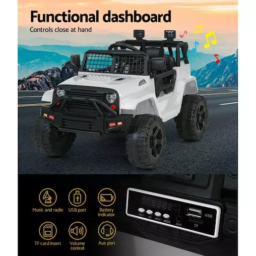 Our off-road ride on jeep is sure to impress your little driver with its looks, performance, and charisma. It boasts a marvellous and distinctive exterior design, brilliant lacquer finish that accentuates its sculpted lines, and a solid build. You also have an option to choose from a black, pink, red and white jeep. It has powerful twin motors for exhilarating performance and thrilling rides, 4-wheel suspension for absorbing shock and ultimate comfort, premium slip-resistant tyres, and a spacious seat with a safety belt for safety and comfort. Plus, it has stylish working doors with a flip latch, stunning headlights for a bright and clear view, and a functional dashboard with functions like horn, music, light switch, keyless start, accelerator pedal, power switch, and forward/reverse switch for a real-like driving experience. Furthermore, the gradual acceleration and deceleration prevents sudden jerks or stops. The remote-control function with emergency brake and speed control and EN71 Standard Safety of Toys certification ensure the safety of the child.