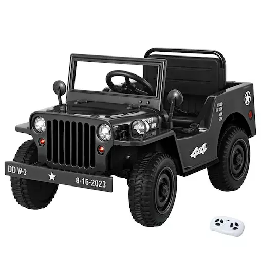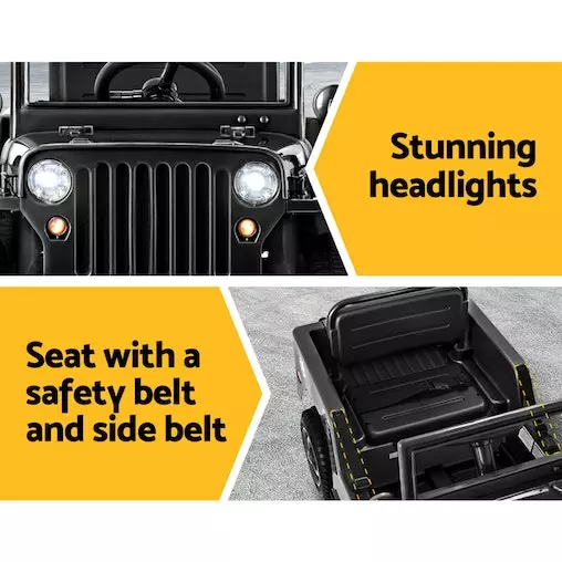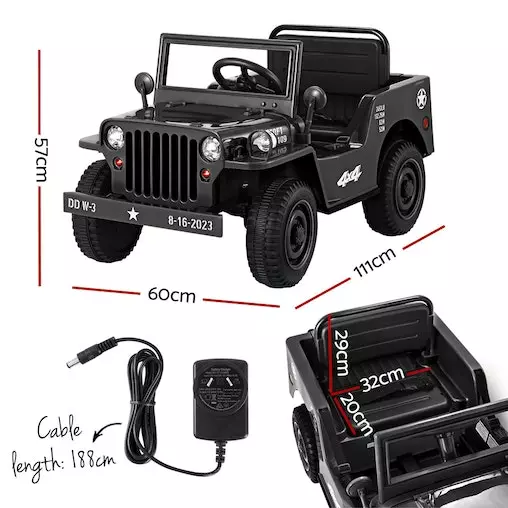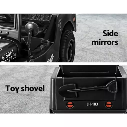 A perfect gift to your aspiring soldiers, our Rigo ride on military-inspired jeep is designed to provide a real-like driving pleasure and experience. It’s sure to make your aspiring soldiers happy with its looks, performance, and charisma and help foster gross motor skills in them. Our ride on military-inspired jeep features a distinctive exterior design with a stunning lacquer finish and solid build. It has four-wheel suspension for shock-absorbing and ultimate comfort, premium slip-resistant tyres, power indicator, smooth acceleration to prevent sudden jerks and stops, and a spacious seat with a safety belt for maximum comfort and protection. Plus, it has striking headlights, powerful 50W twin motors, smart keyless start, and other functions like MP3 connection, flashing lights with music, forward/stop/reverse motion, mirrors, toy shovel, and accelerator pedal for a real-like driving experience. Our ride on jeep is battery operated with up to 2 hours runtime per full charge and comes with a SAA-approved charger for safer and faster charging. With two control modes, the adult remote-control function and EN71 Standard Safety of Toys certification ensures the safety of your child. Purchase this real-like and robust Rigo military-inspired ride on jeep and watch your kids having unlimited fun with their mates.