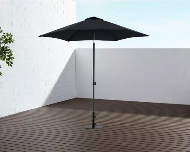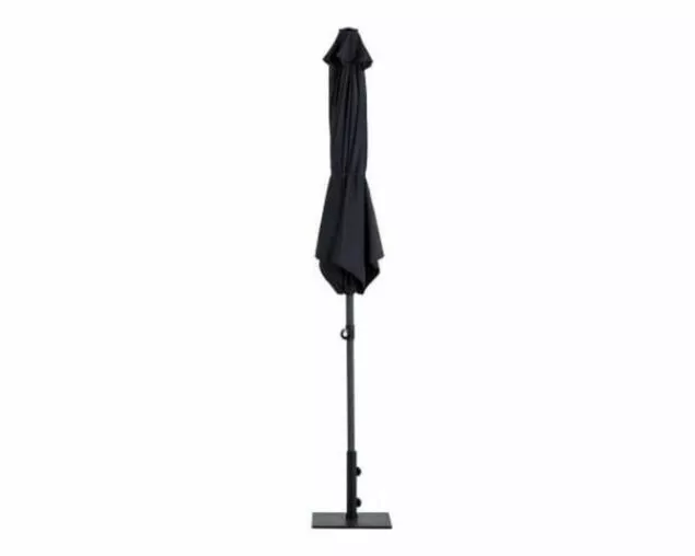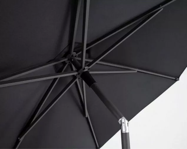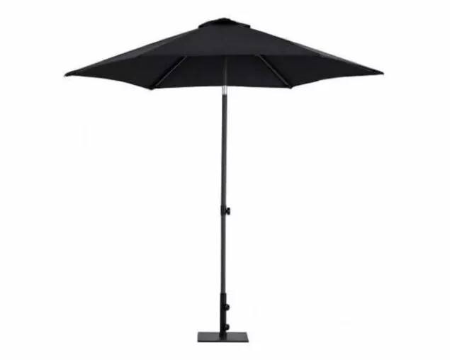 Market umbrella with easy hand push-up system and tilt function in durable powder coated aluminium. 180g polyester canopy with UV rating of 30+. One year frame and canopy warranty. Required base weight 25kg.