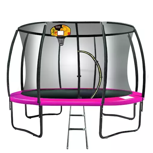 Basketball set! This trampoline is supplied with a basketball kit to add even more fun for the kids. This includes the backboard and ring, net, ball, and pump!