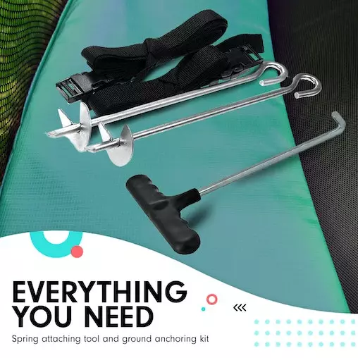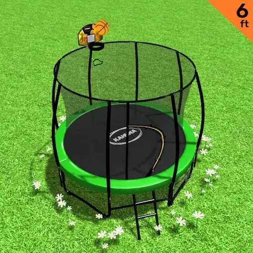Basketball set! This trampoline is supplied with a basketball kit to add even more fun for the kids. This includes the backboard and ring, net, ball, and pump!