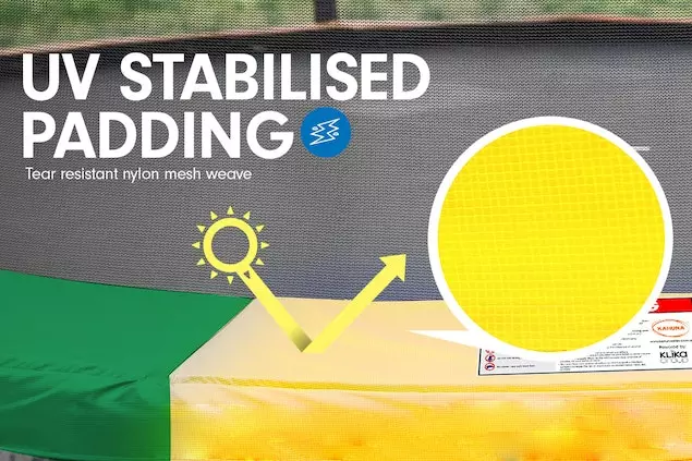 The padding cover of the trampoline is UV stabilized and has embedded nylon mesh, ensuring the padding will last for years under the harsh Australian sun.