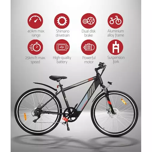 For effortless riding, look no further than our Phoenix Electric Bike. With its 10Ah lithium-ion battery, this astounding electric bike can really go places with as far as 40km on a single charge. The ever-dependable 250W brushless motor can deliver a maximum street-legal speed of up to 25km/h for every cycling activity. Built to last, the bicycle features an aluminium alloy frame that is lightweight and yet strong and sturdy. Better still, the electric bicycle is also loaded with a host of useful features that makes riding it a pleasure. Such as the high-quality Shimano 6-speed shifter mated to large 27? tyres for smoother cruising, thick cushioned seat for extra comfort, front and rear disc brakes for more effective braking and not least, front fork suspension that makes going over rough terrain a less jaw-juggling prospect. At the back, a strong bag rack ensures firm storage while an LED headlight makes night riding as clear as day. With the Phoenix electric bike, getting there is so much more enjoyable with every destination.