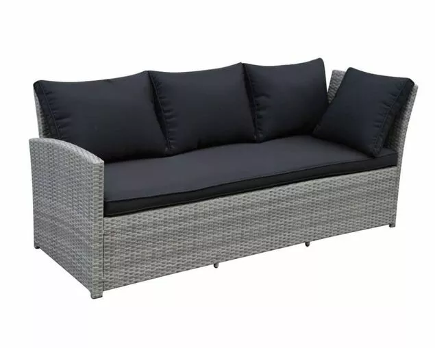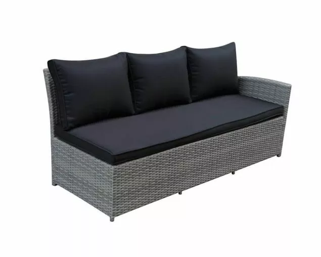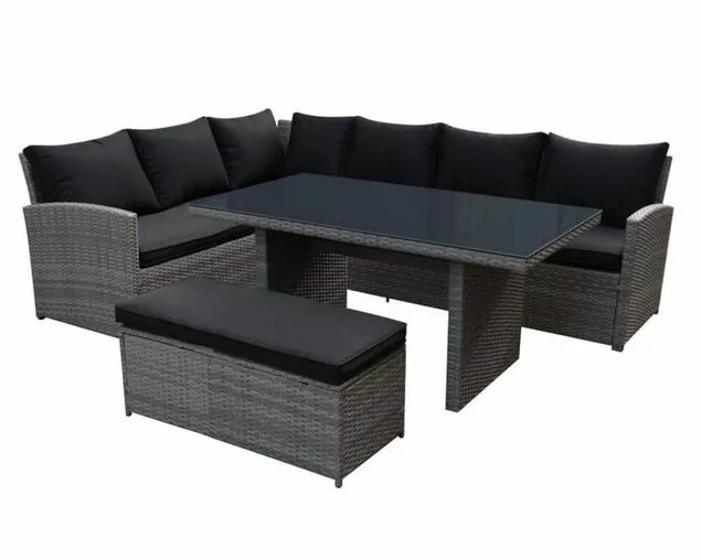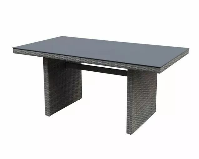 Urban is a modular low dining setting in striking black and taupe, that seats up to 8 people. Made with a sturdy steel frame, 9mm flat wicker with ridged pattern, piped cushions and a dining table topped with dark grey glass.