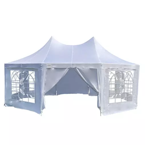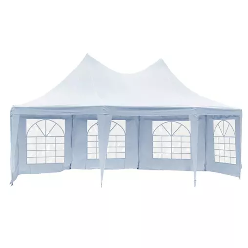 Made with high-quality polyester, this beautiful gazebo includes PVC church windows, removable sidewalls, and a zipper entrance to make up a gorgeous setting.